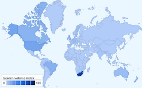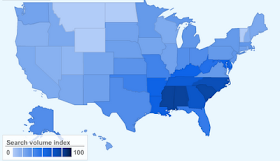 Perhaps unsurprisingly, the states showing the strongest regional interest in "gospel music" videos are southern states: Alabama, Mississippi, South Carolina, North Carolina, and Georgia respectively. (Country-wise, the nation with the strongest proportional search interest is South Africa interestingly enough, and not the United States.)